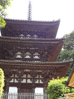 観光雑誌等では情報が少ないので、ご存じ無い方もいらっしゃるかもしれませんが、本堂とは離れて山肌に沿って斗組みの美しい奈良時代の三重塔があります。