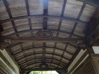 石上神宮の拝殿は鎌倉時代の作品で国宝指定されていますが、神社の拝殿という構えではなく寺の雰囲気を持つ立派な建物です。細工は貫や木鼻、そして扉を支える藁座のある禅宗様が採用されていました。太目の垂木を大胆に見せつけていますが、柱のサイズやスパン割りはとっても繊細な印象を受けました。ただ残念なことに吊るし燈籠に接続する配線が露出しコンセントが丸見えになっていて残念です。気を取り直して一歩下がって屋根に目を移すと、拝殿の屋根は檜皮の入母屋です。全体的にバランスが良く端整な気品のある建物ですが先生の目的の拝殿ではなかったようです。