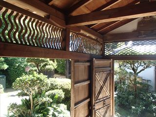 中央が通り抜けできる設計で、その左右に細長く広がる平面計画は対称形のバランスの良い建物でした。通り抜けできる中央部の屋根は、切れ長の唐破風でできていて、縁側の下には亀腹の漆喰が見えます。濡れ縁は水平線を強調するように、大胆に小口を見せた床板が配置されています。建具は引き違いの格子戸で、まるで平安時代の住宅のようです。シンプルですが形のいい粋な日本建築を見せ付けられたそんな気がしました。